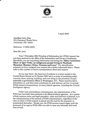 Freedom of Information Act Searches Here is documentation on our efforts to see how the Akha are filed away in US Government files.