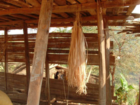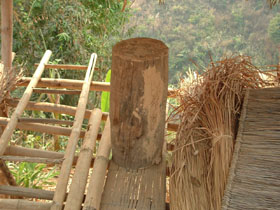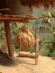 Please remember to do a site search for other related documents which may not be shown here. Gow Lang 2 Eleven huts line both sides of the road making up one of the poorest dustiest villages in this area. At the one end of the village the Chinese American Baptist missionaries have built a missionizing hut to try and convert the village away from their traditional life. A wire runs from the hut of one of the first persuaded to convert. Always the story is that they are just there to teach the kids how to write in Akha and save the culture. The lies get increasingly complex and manipulative. They seem to forget that they only book they are going to supply in Akha language is the bible. The missions harvest the villages as a resource no different than any other. Taking another man's corn, corn they didn't plant, changing children's minds to abandon who they are, Akha, and give control to the missionaries. No wealth or health is brougth to the village, only lies and propaganda. So far three villagers have fallen to the scam. The village is hot and dusty. Clouds of dust roll across the huts as trucks roar up the road towards Hua Mae Kom, some ten kilometers further to the end of this part of Thailand. An old man chisels a mortice in a piece of wood. He's making a new door for the house. "People coming and going, my door always gets torn apart," he says. "Making a good one!" Eight families are still traditional. The mission is after everyone. Few christian villages allow even a couple huts to stay traditional while by comparison the traditional Akah will allow christian families to stay in their village, though the radical, disruptive and divisive methods of the missionaries brings anger and fighting to the village. Many villages are split. A village that is being split by the missions is always at stress, and a converted village is a village of Akha who have given up. The villagers say that many coffee plants have died this year because there hasn't been rain for five months. The brown dust on everything emphasizes his words. I move into the shade to get out of the morning sun, already burning through my shirt. An old man next to me tells me he's 85 years old. He's seen it all at least once I figure. "We only know how to farm," he tells me. A boy in a red shirt tells me he is in the village mid day because he doesn't have enough money to go anywhere and there isn't any work. A few fields are ready, waiting for the rain and planting. An old woman on the other side of the road is all dressed out in Akha clothes. She has to work. She is old. Her husband is old. She has only one son. He isn't married yet. There is no one else to feed them. A happy talkativeman sits nearby. Laughter a respite for the misery and hopelessness. They only ahve a few fields he says. There is a small trickle of water into the village cistern. Gow Lang 1 Akha village is over on another hill nearby, a different village, a different set of problems, yet the dirge of sad music blends together in all the tragedies. An old woman sits on an a porch, repairing her head dress, adding beads and coins for those damaged or lost. I drive slowly out of the village, wishing I had some fruit trees to offer. Anything.